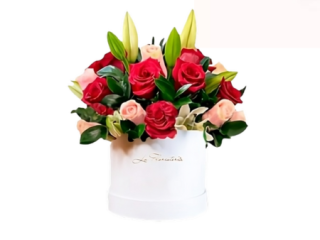 Box de Rosas & Liliums, elaborado con media docena de rosas rojas, media docena de rosas rosadas y fino follaje de vivero.