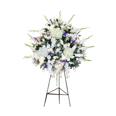Corona de Rosas e Iris. Corona de condolencias de Rosas blancas adornadas con iris y flores del campo en pedestal. Medida aprox 2 mt
