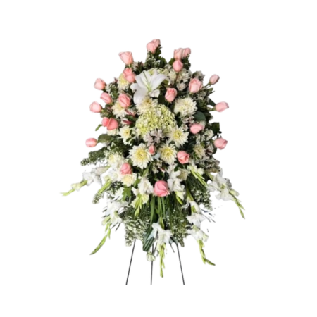 Corona de Condolencias de Rosas Rosadas. Elaborada con Rosas y flores del campo y fino follaje de vivero en pedestal. Medida aprox. 2 mt de alto.