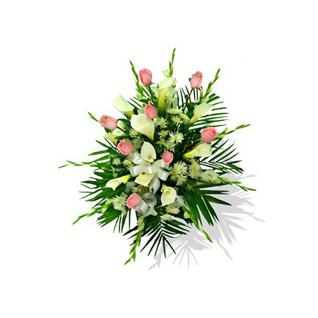 Lágrima de piso de rosas rosadas para difunta, elaborada con flores del campo adornadas con fino follaje de vivero.